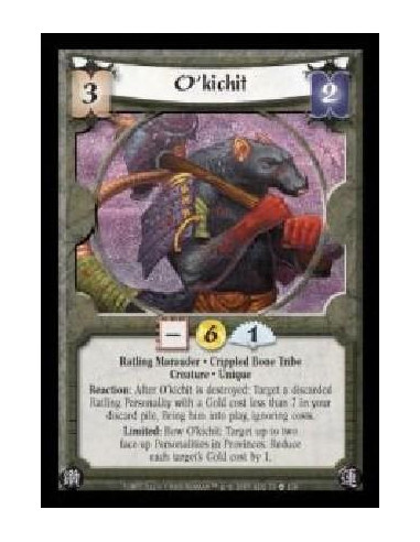 Ratling Marauder · Crippled Bone Tribe · Creature · Unique. Reaction: After O'kichit is destroyed: Target a discarded Ratling Personality with a Gold cost less than 7 in your discard pile. Bring him into play, ignoring costs. Limited: Bow O'kichit: target up to two face-up Personalities in Provinces. Reduce each target's Gold cost by 1.