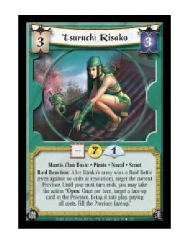 Mantis Clan Bushi · Pirate · Naval · Scout. Raid Reaction: After Risako's army wins a Raid Battle (even against no units at resolution), target the current Province. Until your next turn ends, you may take the action ?Open: Once per turn, target a face-up card in the Province. Bring it into play, paying all costs. Fill the Province face-up.?