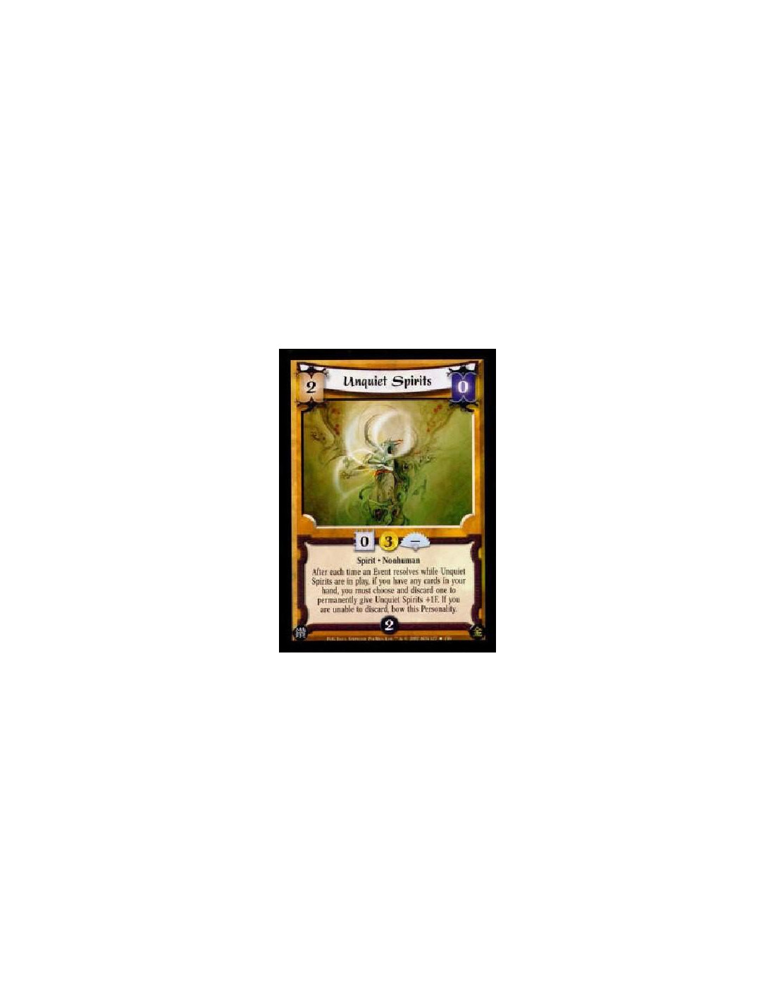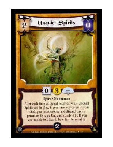 Spirit * NonhumanAfter each time an Event resolves while Unquiet Spirits are in play, if you have any cards in your hand, you must choose and discard one to permanently give Unquiet Spirits +1F. If you are unable to discard, bow this Personality.