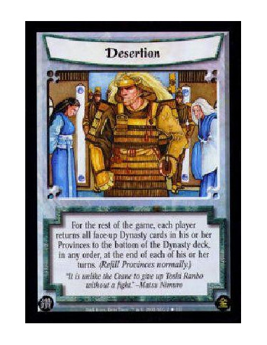 You can only play one Desperate Wager per turn. Reaction : Before your Dynasty Phase begins: Straighten all your Personalities. Declare an additional Attack Phase. After its Declaration Segment, straighten all the Defender's Personalities and Followers; this straightening can not be negated. You lose the game at the end of the turn