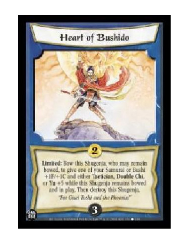 Reaction: After an action is announced: Negate all Honor gains until after the action’s resolution. At that time, if this negated any gains, negate all Honor gains until the end of this phase and draw a card. Battle: Choose your performing unbowed Personality: Bow a target enemy card with lower Force and without attachments. Bow its unit if your...