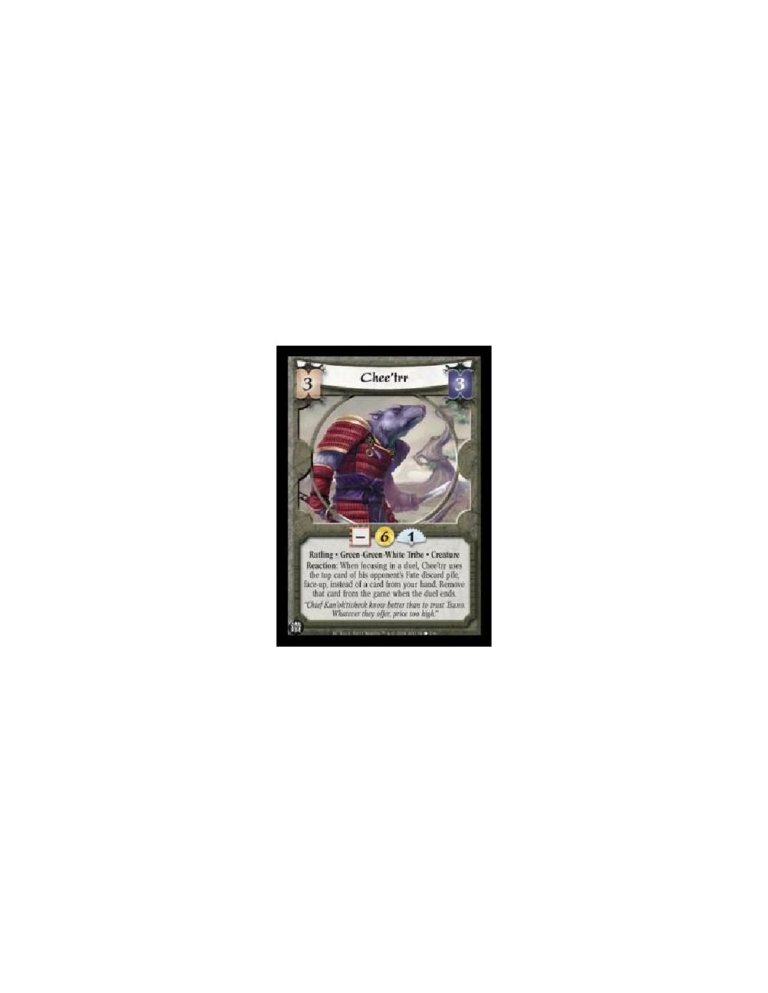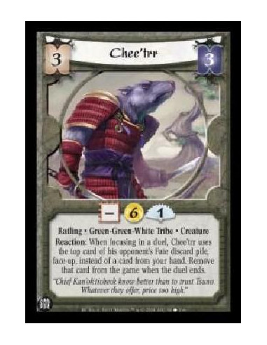 Ratling . Green-Green-White Tribe . Creature Reaction: When focusing in a duel, Chee'trr uses the top card of his opponent's Fate discard pile, face-up, instead of a card from your hand. Remove that card from the game when the duel ends.
