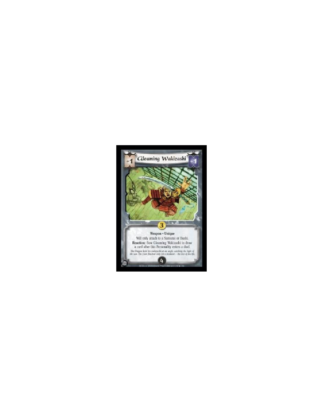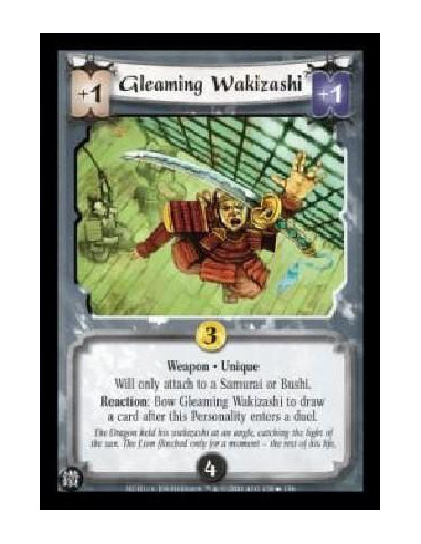 Weapon . Unique Will only attach to a Samurai or Bushi. Reaction: Bow Gleaming Wakizashi to draw a card after this Personality enters a duel.