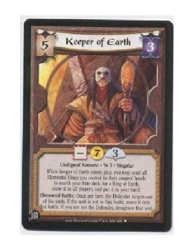 Unaligned Samurai · Yu 3 · Singular When Keeper of Earth enters play, you may send all elemental Rings you control to their owners' hands to search your Fate deck for a Ring of Earth, show it to all players, and put it into your hand. Elemental Battle: Once per turn, the Defender targets one of his units. If the unit is not in this battle, move it into this battle. If you are not the Defender, straighten that unit.