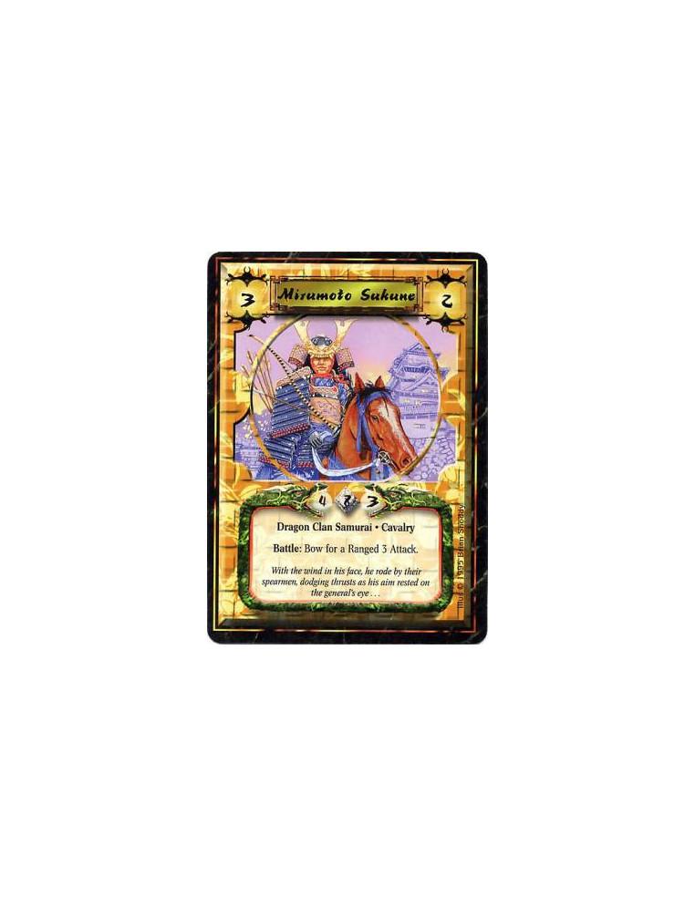 Dragon Clan • Samurai • Cavalry • Kensai Battle: You may bow one of Mori’s Weapons: Target an enemy card. Bow it if it has no attachments or if you bowed a Weapon.