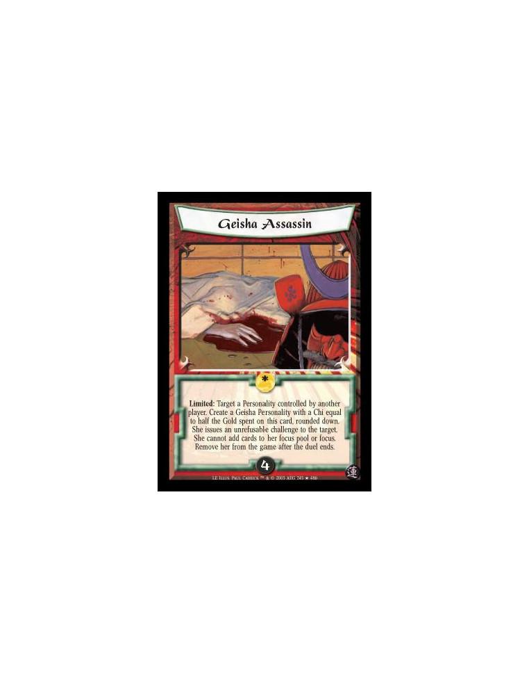 Limited: Target a Personality controlled by another player. Create a Geisha Personality with a Chi equal to half the Gold spent on this card, rounded down. She issues an unrefusable challenge to the target. She cannot add cards to her focus pool or focus. Remove her from the game after the duel ends.